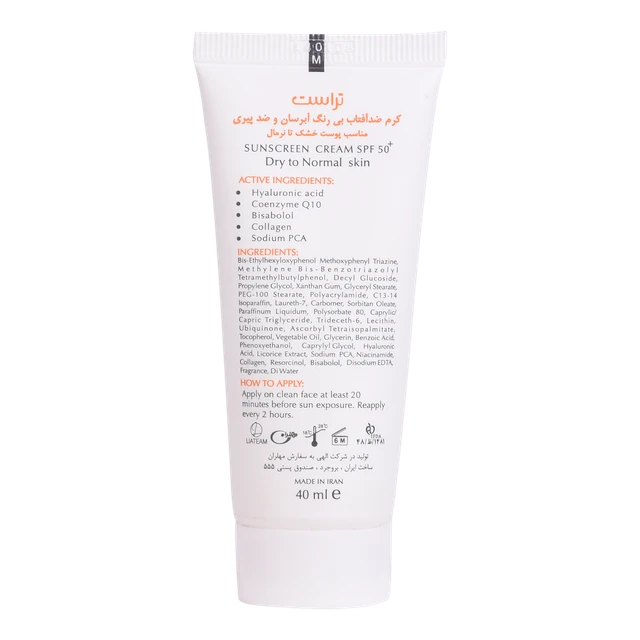 کرم ضدآفتاب و ضدپیری SPF +50 تراست، با استفاده از مرغوبترین و جدیدترین مواد اولیه همچون هیالورونیک اسید و کوآنزیم کیوتن از پوست شما دربرابر پرتوهای مضر آفتاب به طور کامل محافظت میکند. این کرم علاوه بر مهار رادیکالهای آزاد و محافظت از پوست دربرابر آلودگیهای محیطی، از تخریب سلولهای پوستی، بروز چینوچروک، پیری زودس و لکهای ناشی از آفتاب نیز جلوگیری میکند. این محصول بافتی سبک داشته و با قابلیت جذب سریع و آبرسانی قویِ پوست خشک و حفظ رطوبت آن، پس از مصرف منافذ پوستی را نبسته و هیچ خللی در روند تنفس سلولهای پوستی ایجاد نمیکند.